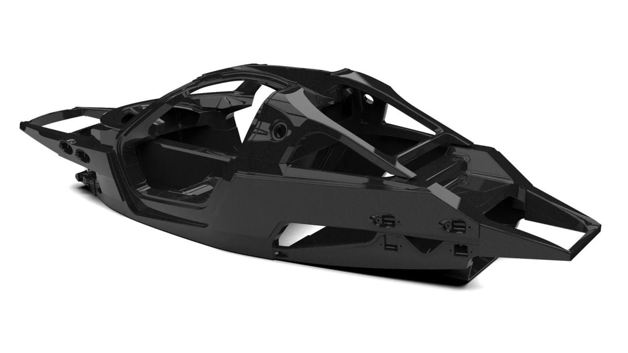 The Aurora’s powertrain sits in a full carbon-fiber chassis with a modular design. Referred to as the ZM1, the chassis uses carbon fiber not only for the passenger cell but also the front and rear subframes, in essence creating one giant composite component. Not only is such a design extremely rigid, it’s also extremely light, with Zenvo quoting a weight of less than 265 pounds. It’s also very safe, as it integrates energy absorbing crash structures similar to F1 cars.